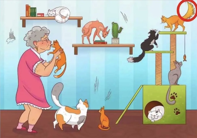 Voici la réponse en image : L’erreur dans l’image est que l’un des chats a la queue d’un chien.