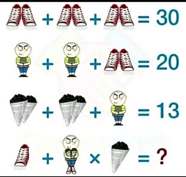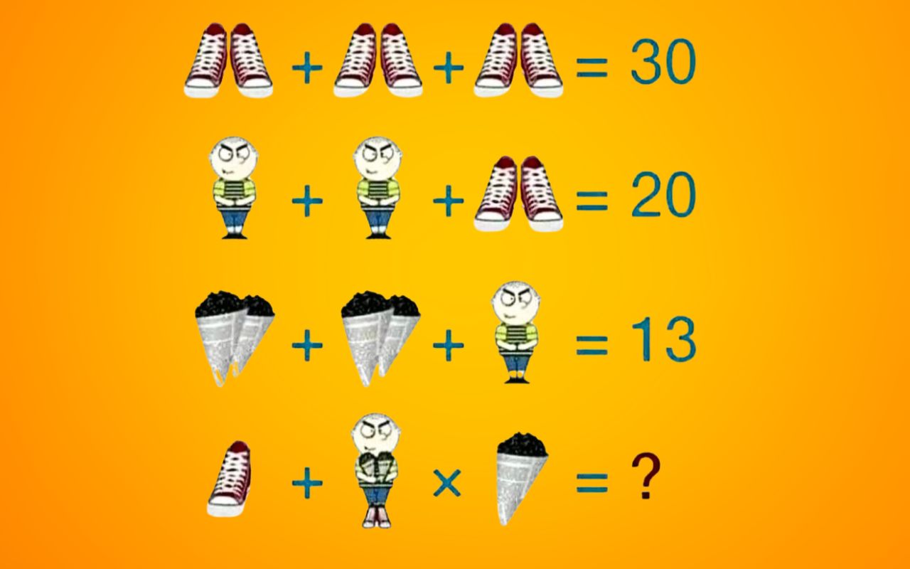 Le puzzle se présente sous la forme d’une série de trois équations visuelles impliquant des images de chaussures rouges, de personnages et de cônes de crème glacée, suivies d’une question finale. Dans la première ligne, trois paires de chaussures rouges sont additionnées pour égaler trente. La deuxième ligne montre un personnage plus une paire de chaussures égalant vingt. La troisième ligne consiste en un cône de crème glacée plus un personnage égalant treize. Enfin, la dernière ligne est une combinaison d’une chaussure, un personnage et un cône de crème glacée multipliés ensemble, et c’est là que la valeur doit être déterminée.
