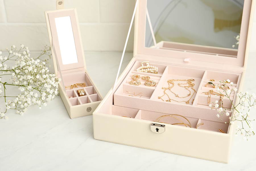 Écrins à bijoux : similaires aux coffrets, les écrins sont plus compacts et destinés au rangement de quelques bijoux précis comme une bague de fiançailles ou un collier de perles. Ils sont souvent fabriqués en velours ou en satin pour offrir un toucher doux et luxueux.