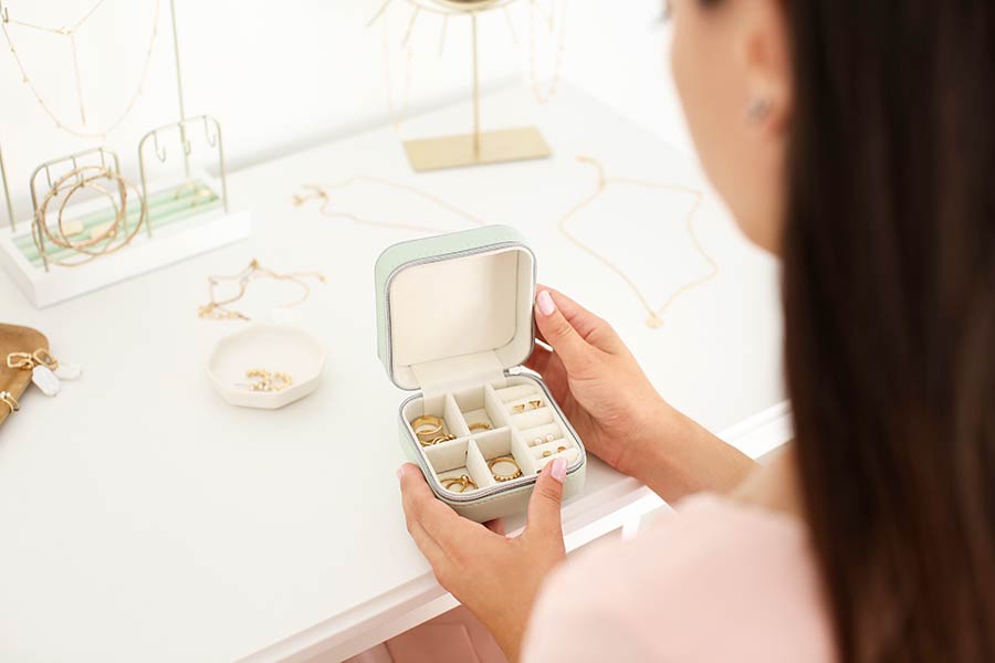 Dépoussiérez régulièrement votre boîte à bijoux avec un chiffon doux et propre pour éviter l’accumulation de poussière et protéger vos bijoux contre les rayures.